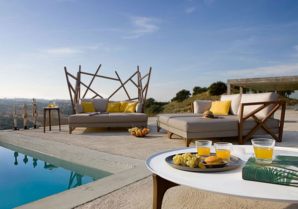 Tra i mobili da giardino e da esterno di lusso non può mancare un salotto di design in rattan e alluminio verniciato, come quello realizzato dall’italiano Pierantonio Bonacina.